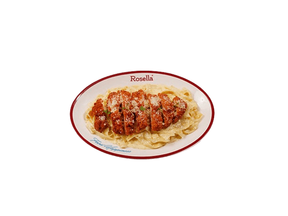 Alfredo pasta served with classic Rosella mix with crispy chicken pieces, and a sprinkle of Parmesan.