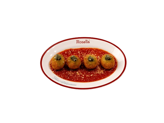Fried golden burrata balls with tomato basil sauce.