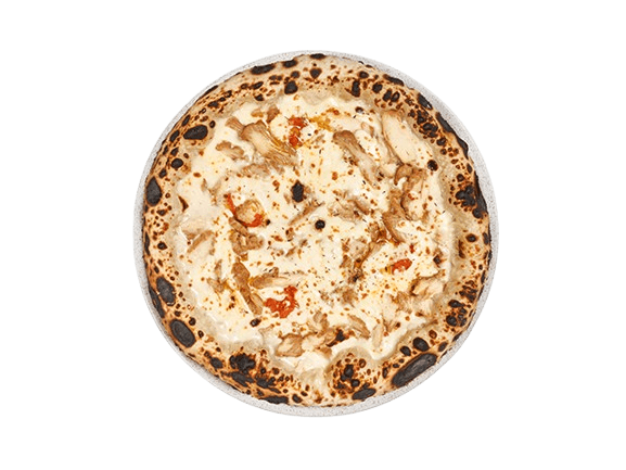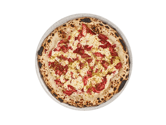 Smoked Chicken Pizza with white sauce, cherry, finished with Rosella oil.