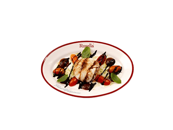 Fresh burrata cheese served with Rosella special tomato sauce with sweet Baby tomato and Baby rocket